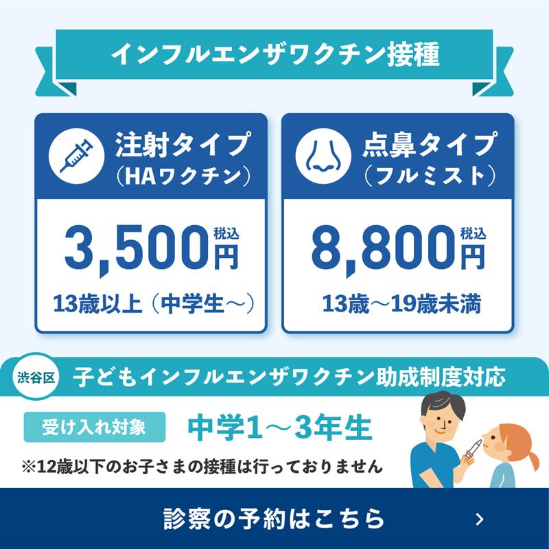 ※フルミストは2歳以上19歳未満の方が接種可能ですが、当院では12歳以下のお子さまの接種は行っておりません。